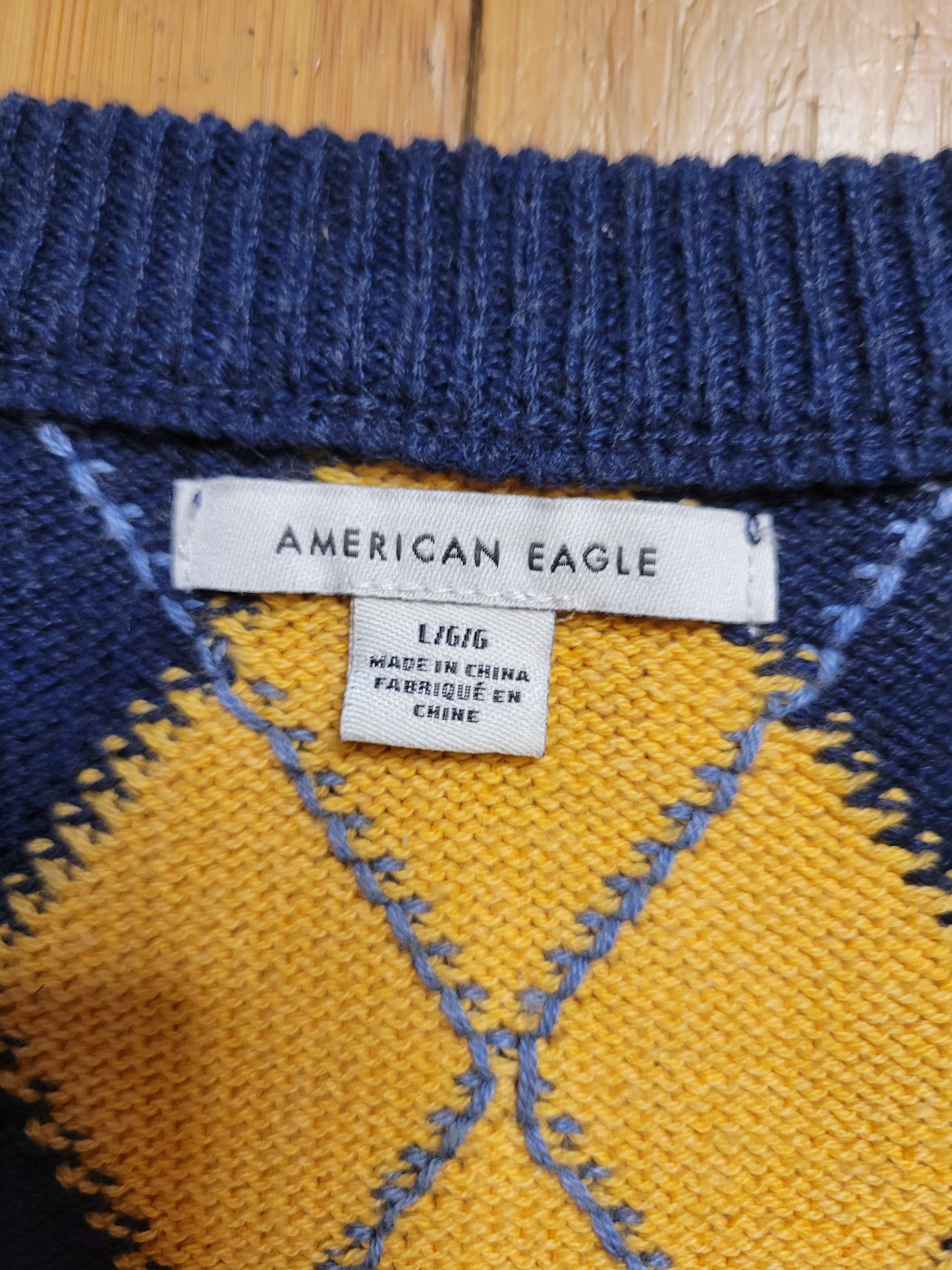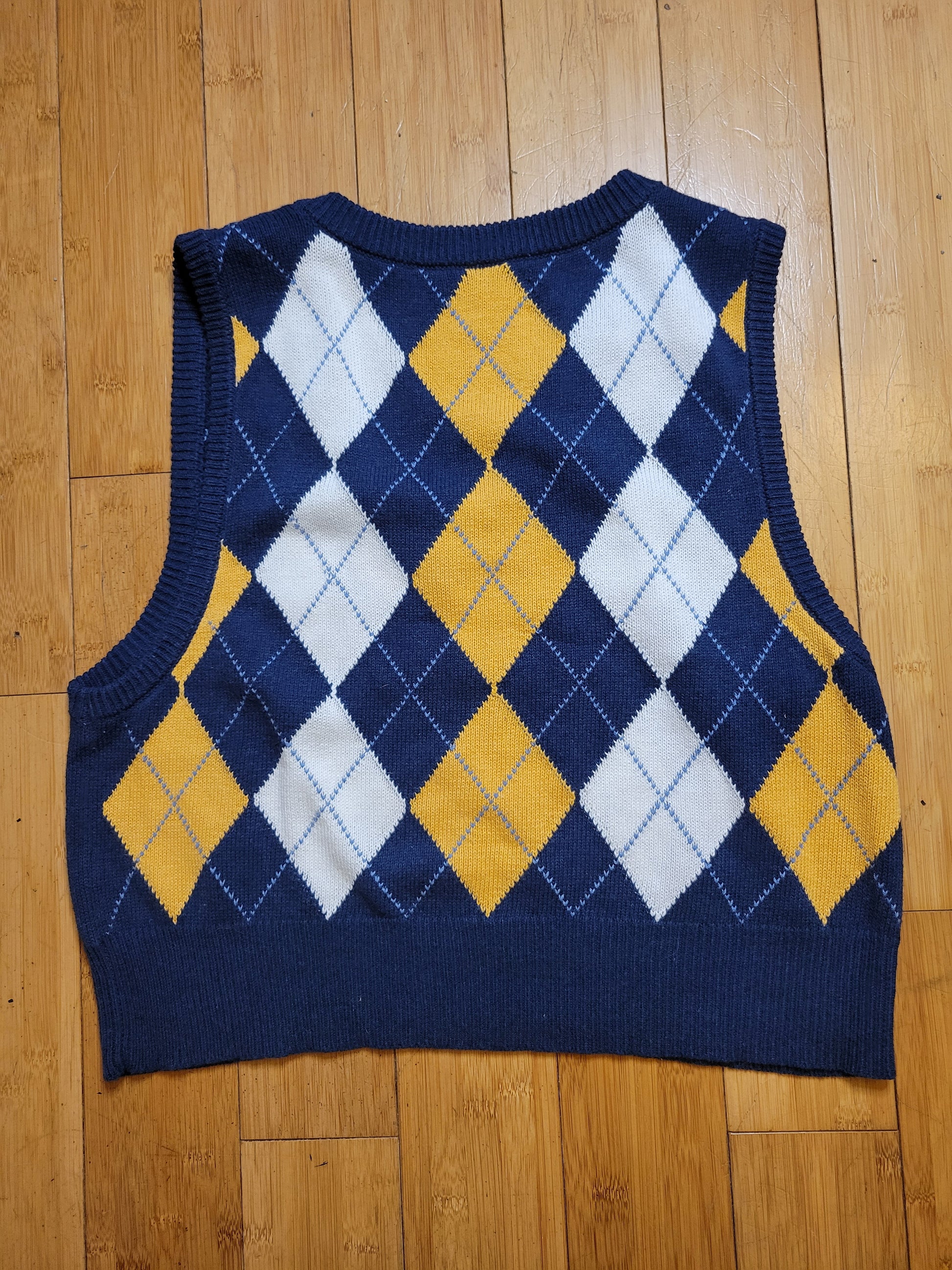 This charming American Eagle argyle vest brings a touch of classic collegiate style with a modern, cozy feel. The knit is soft and stretchy, offering a comfortable fit while keeping its structure beautifully. A rich navy blue sets the stage for bold mustard diamonds and crisp ivory accents, creating a timeless argyle pattern that pairs effortlessly with crisp white blouses, turtlenecks, or layered fall looks.
