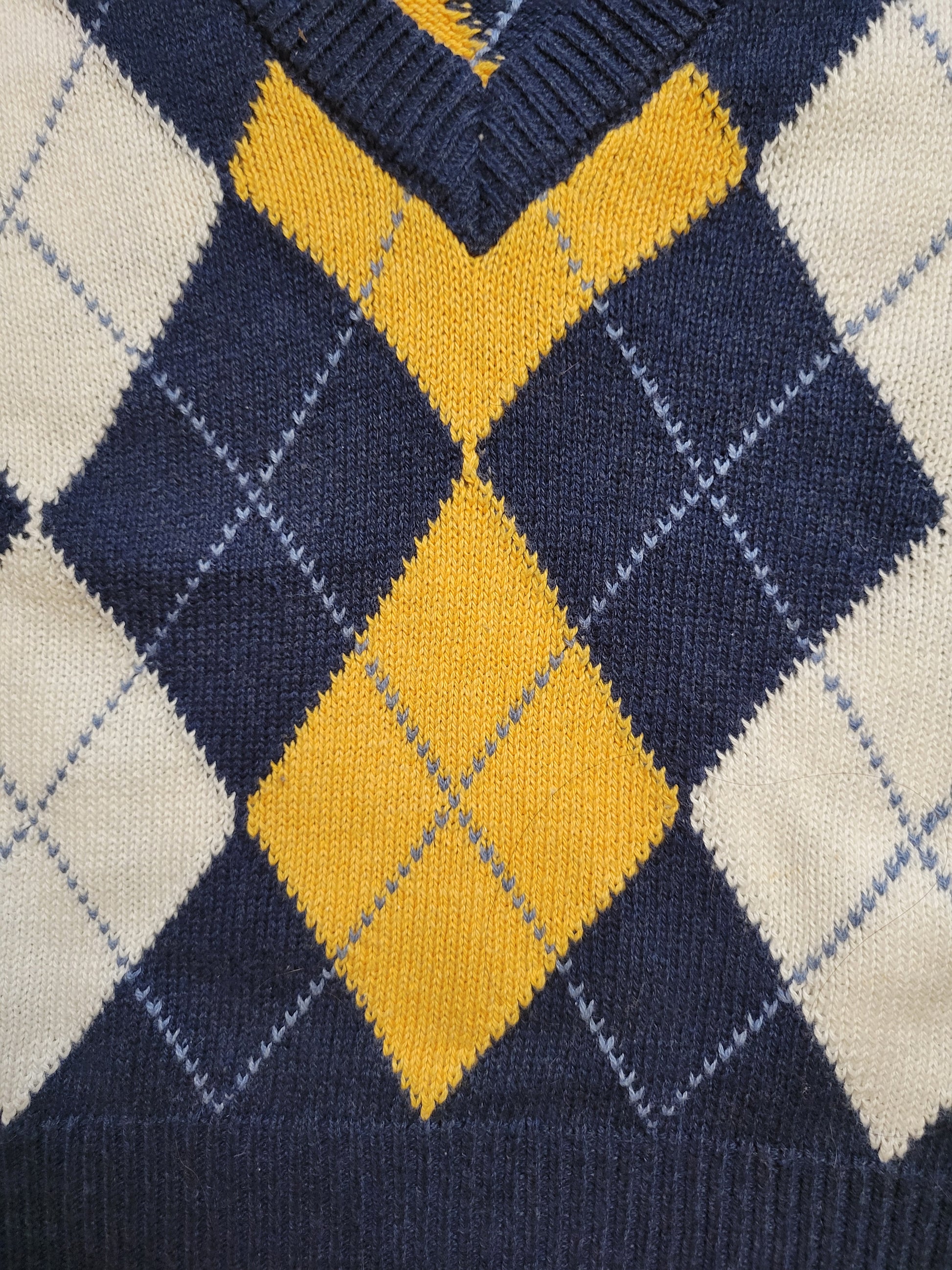 Navy, mustard, and ivory argyle knit