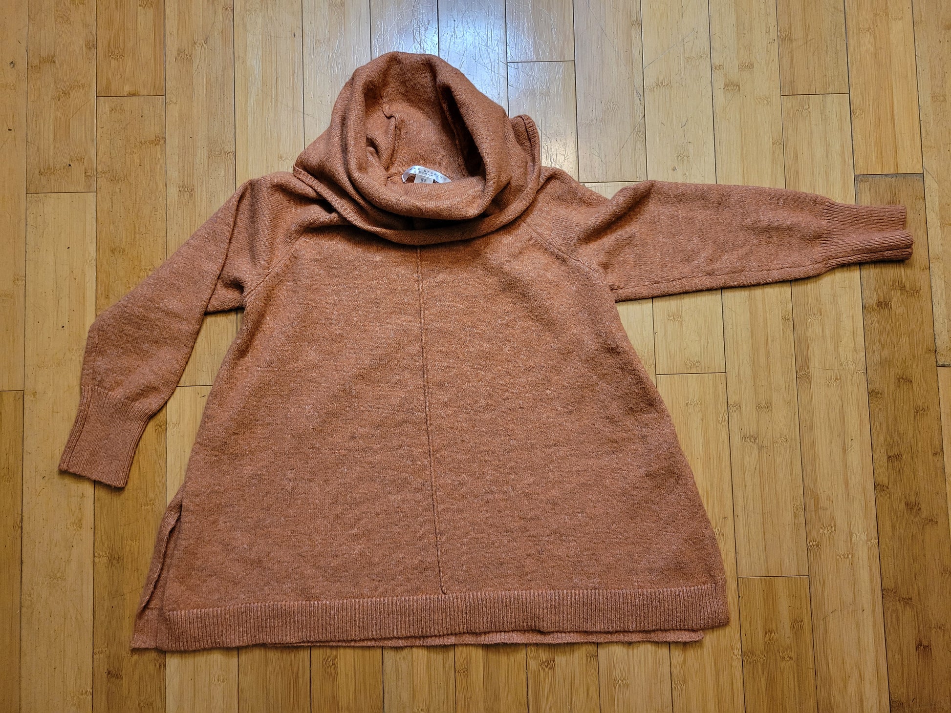 A wonderfully warm and sculpted knit in a rich rust-heathered hue, this Max Studio sweater brings together comfort, elegance, and an effortlessly cozy silhouette. The long, dramatic cowl neckline drapes softly for a luxe, wrapped-in-warmth feel, while the vertical front and back seam create an elongating line that subtly shapes the body. Ribbed cuffs and hem add structure and polish, giving this sweater a refined finish that pairs beautifully with slim trousers, dark denim, or wool skirts through the colder seasons.