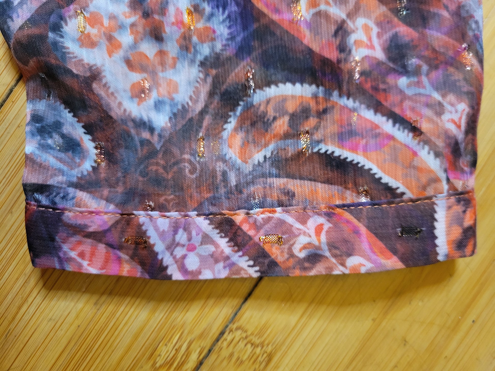 mesmerizing, warm-toned blouse that feels like the sartorial equivalent of a fresh-baked cranberry-orange scone—soft, inviting, and kissed with golden sparkle. This sheer button-front top blends swirling paisleys in cranberry, mulberry, mandarin, cocoa, and cream, all woven with tiny flecks of metallic gold thread that catch the light beautifully. The lightweight chiffon drapes gently against the skin, offering a romantic, effortless silhouette that pairs perfectly with denim, tailored trousers, or soft knit skirts. Seven fabric-covered buttons run down the front, adding sophistication to the already artful pattern. This is an elegant, floaty statement piece designed for layered styling and year-round charm.