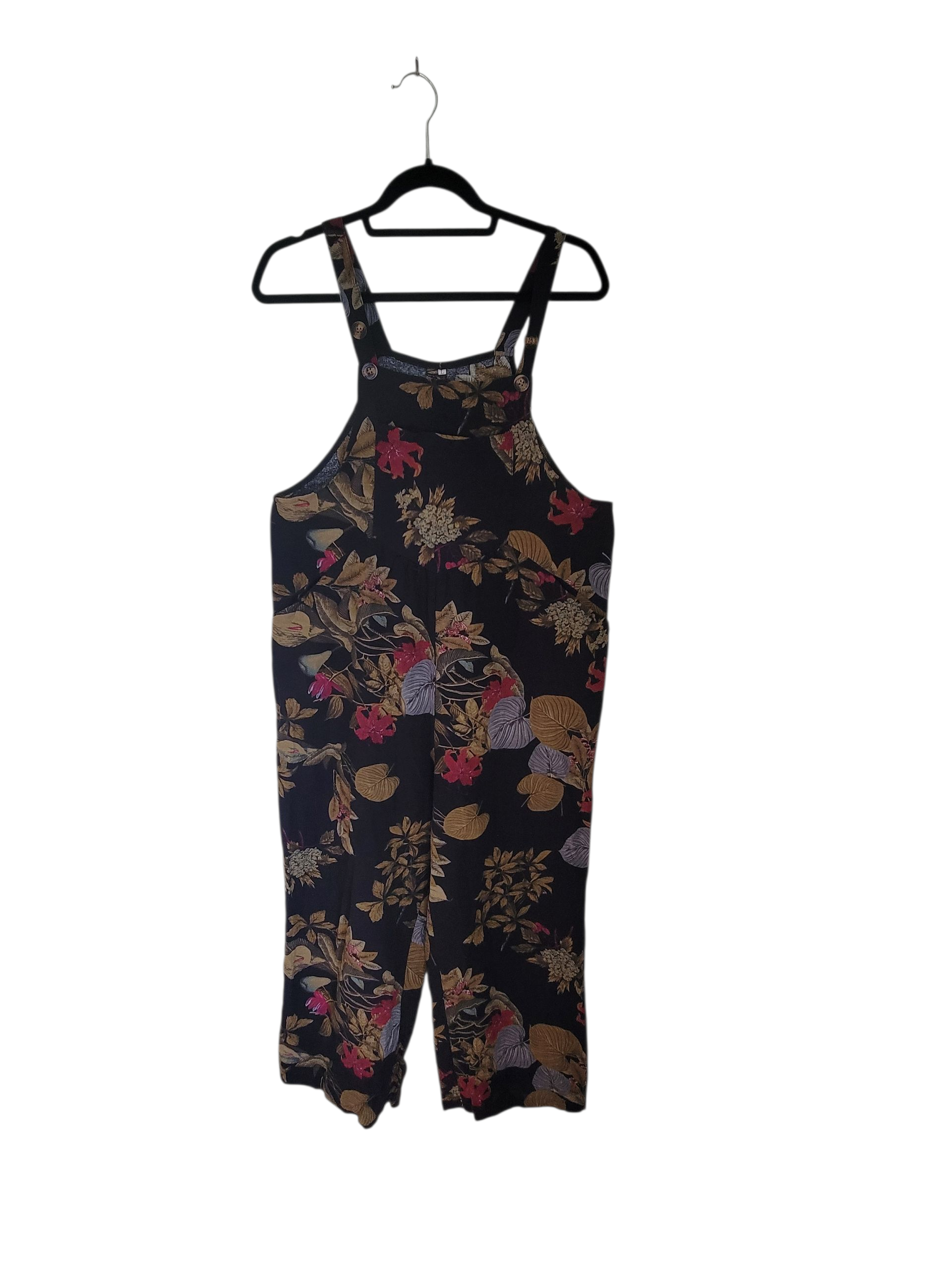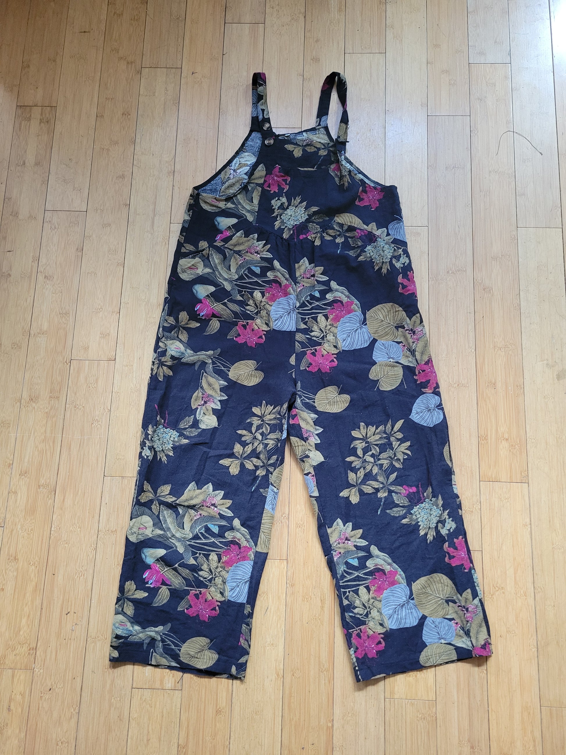 A relaxed and softly-draped pair of floral overalls that feel both easygoing and thoughtfully detailed. The fabric is lightweight with a fluid movement, patterned in a warm botanical print of ochre leaves, soft sage greens, and vivid berry-toned blossoms against a deep charcoal backdrop. The front bib features gentle gathering for shape, creating a feminine silhouette without sacrificing comfort or ease.
