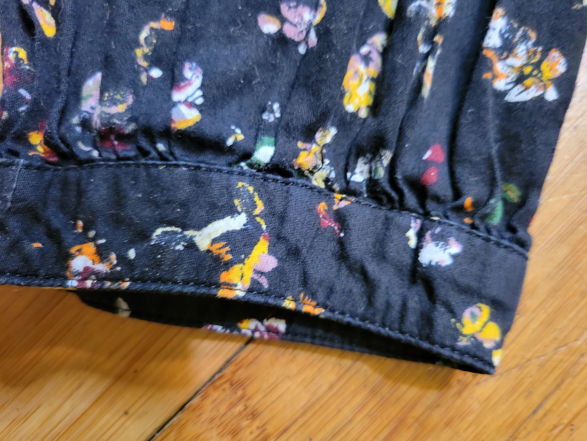 A softly draping blouse that feels like a midnight stroll through a garden—gentle, scattered florals dancing across a deep black background. This GAP XL top offers a relaxed, airy silhouette with long sleeves that gather into a subtle cuff, giving it a softly billowed effect. The lightweight weave makes it perfect for layering under cardigans, denim jackets, or structured blazers, and the double-button keyhole closure at the back adds a quiet touch of polish. Its palette of cream, orange, maroon, and soft green opens endless styling options, blending beautifully with denim, tailored trousers, or autumn-toned skirts.