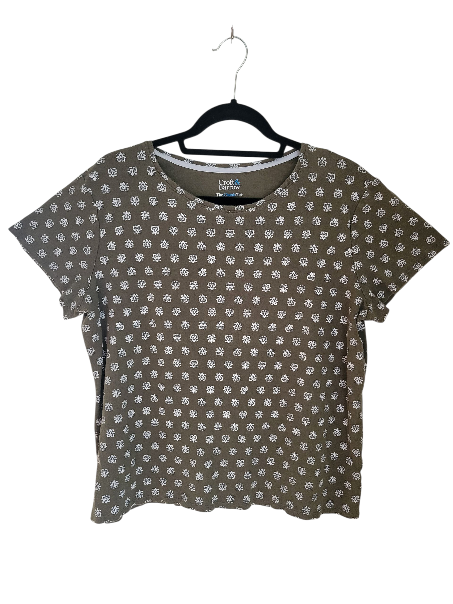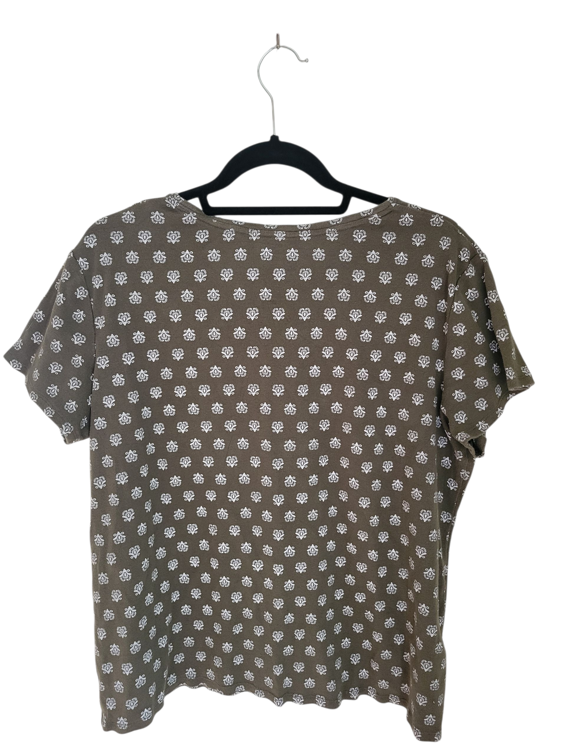 A soft, easy staple with quiet charm, this olive green tee from Croft & Barrow offers a gentle pattern of white floral medallions that reads polished without trying. The fit is relaxed yet shaped, with a smooth cotton hand that lays clean under layers. It’s the kind of piece that elevates casual dressing—simple, pretty, and endlessly wearable.