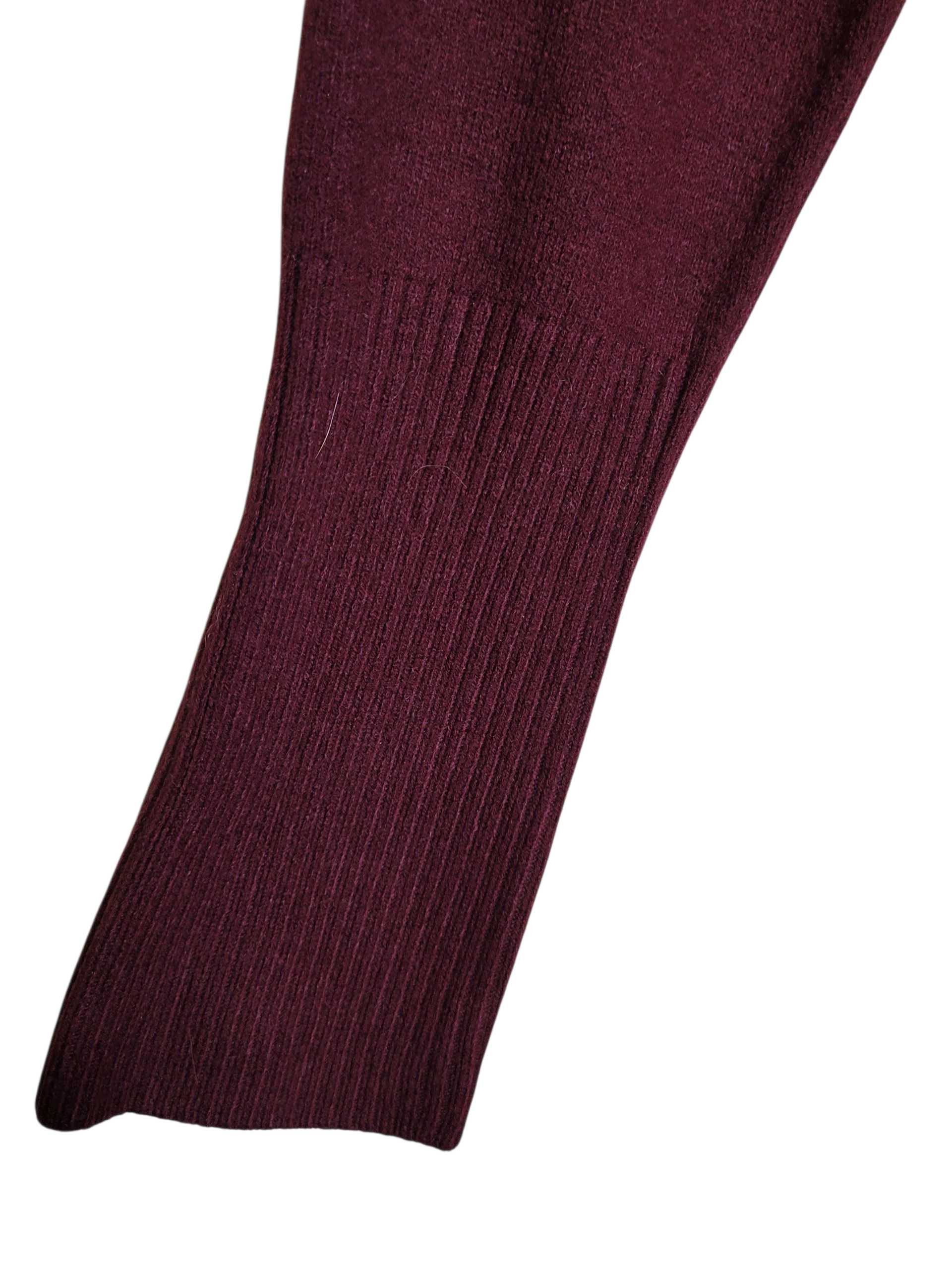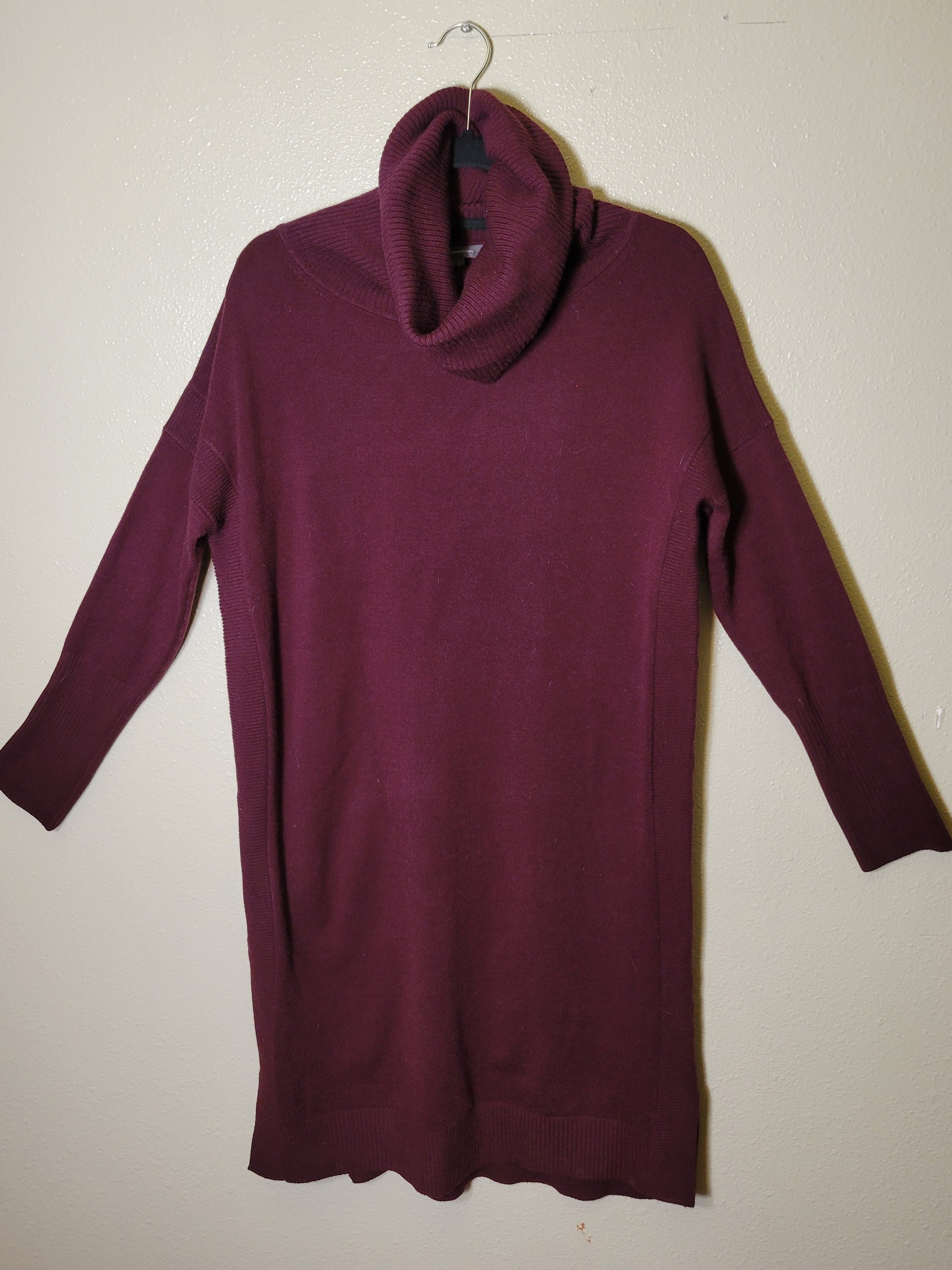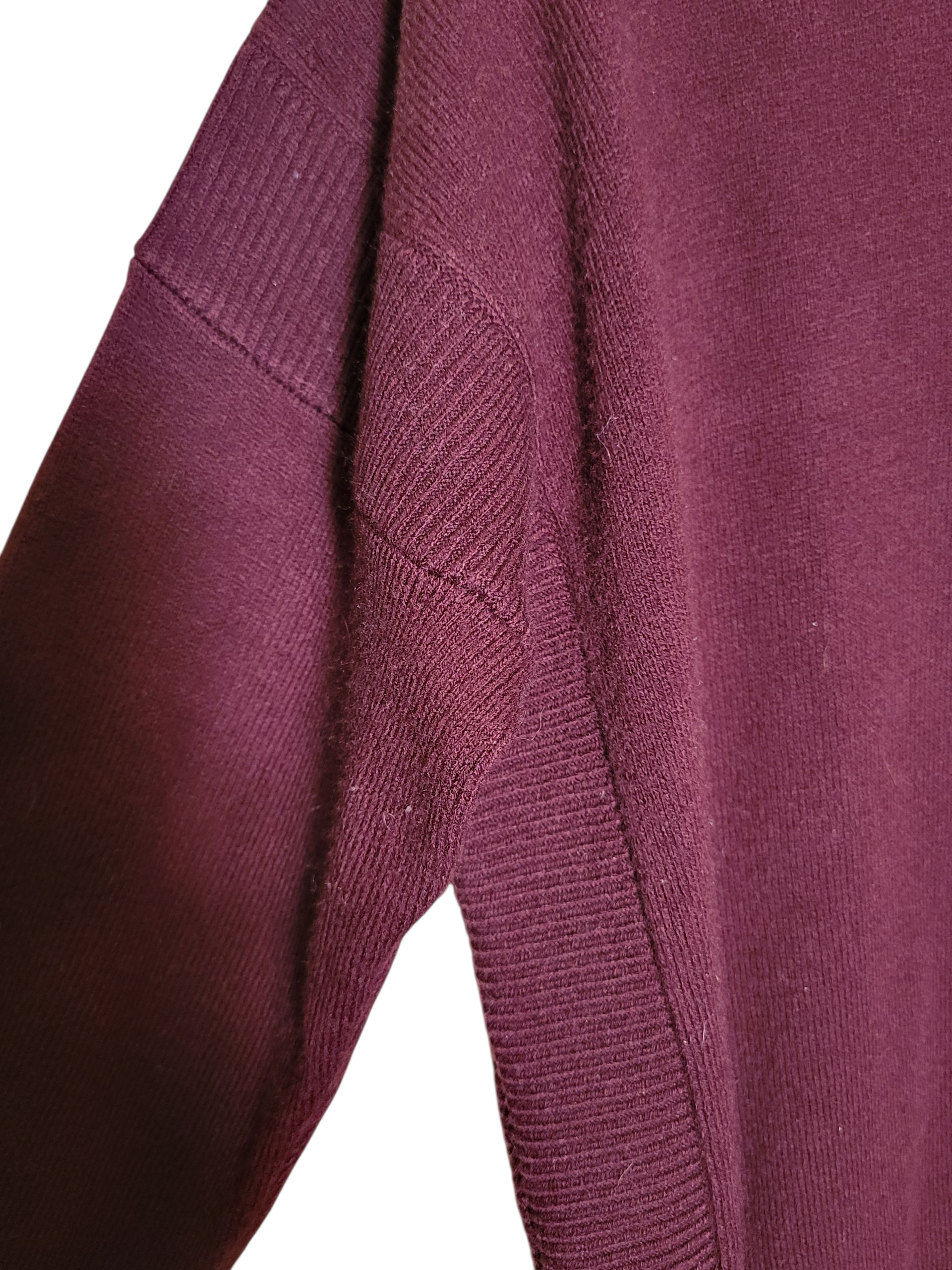 A beautifully refined cold-season staple, this French Connection sweater dress blends cozy comfort with understated sophistication. The rich plum-burgundy tone offers depth and warmth, while the soft rib-knit detailing along the cuffs, side panels, and hem creates a true tailored finish. The generous rolled turtleneck adds an elegant, sculptural touch that frames the face and invites softness into the look.