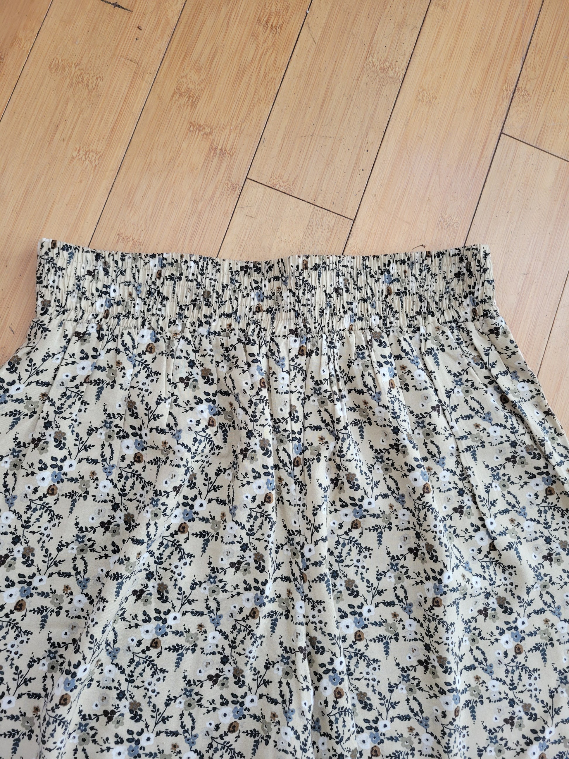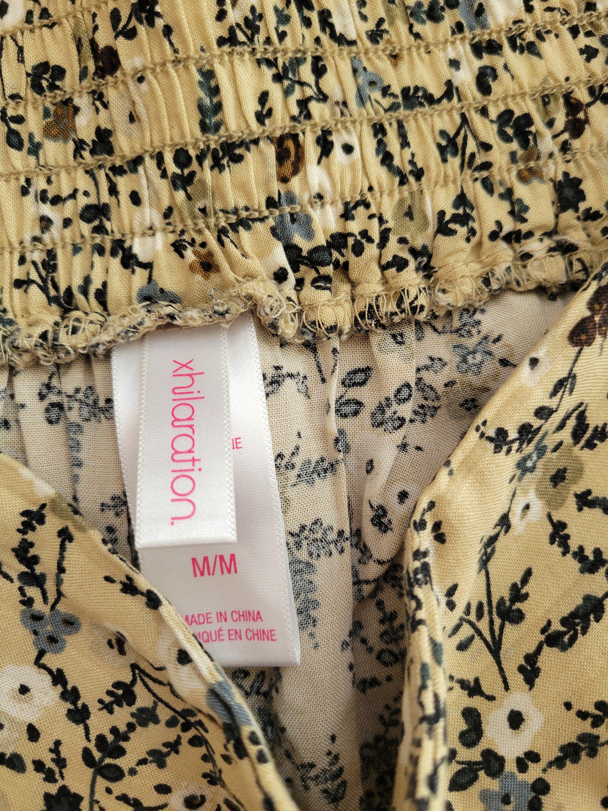 Lightweight, airy, and quietly romantic, these wide-leg trousers from Xhilaration bring a soft sense of movement and ease. The print is a delicate botanical scatter of cocoa brown, slate grey, ivory, and inky black blossoms, floating across a warm sand-tan ground. The silhouette is relaxed yet feminine, with gentle pleating through the hip and a flattering wide leg that drapes beautifully. The waistband is designed with comfort in mind — smooth and structured at the front, softly elasticated at the back for an easy, flexible fit.