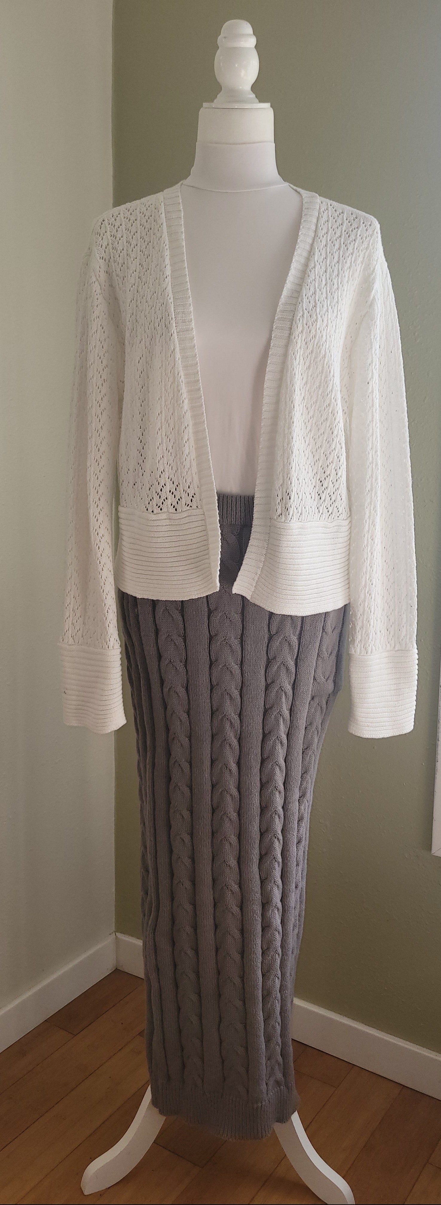 Though it has no size tag, the cardigan’s gently draped cut and flexible knit comfortably fit sizes Medium through XL. Elegant yet effortless, it’s ideal for slipping over dresses, turtlenecks, or soft knit tops when you want to add warmth without weight.
