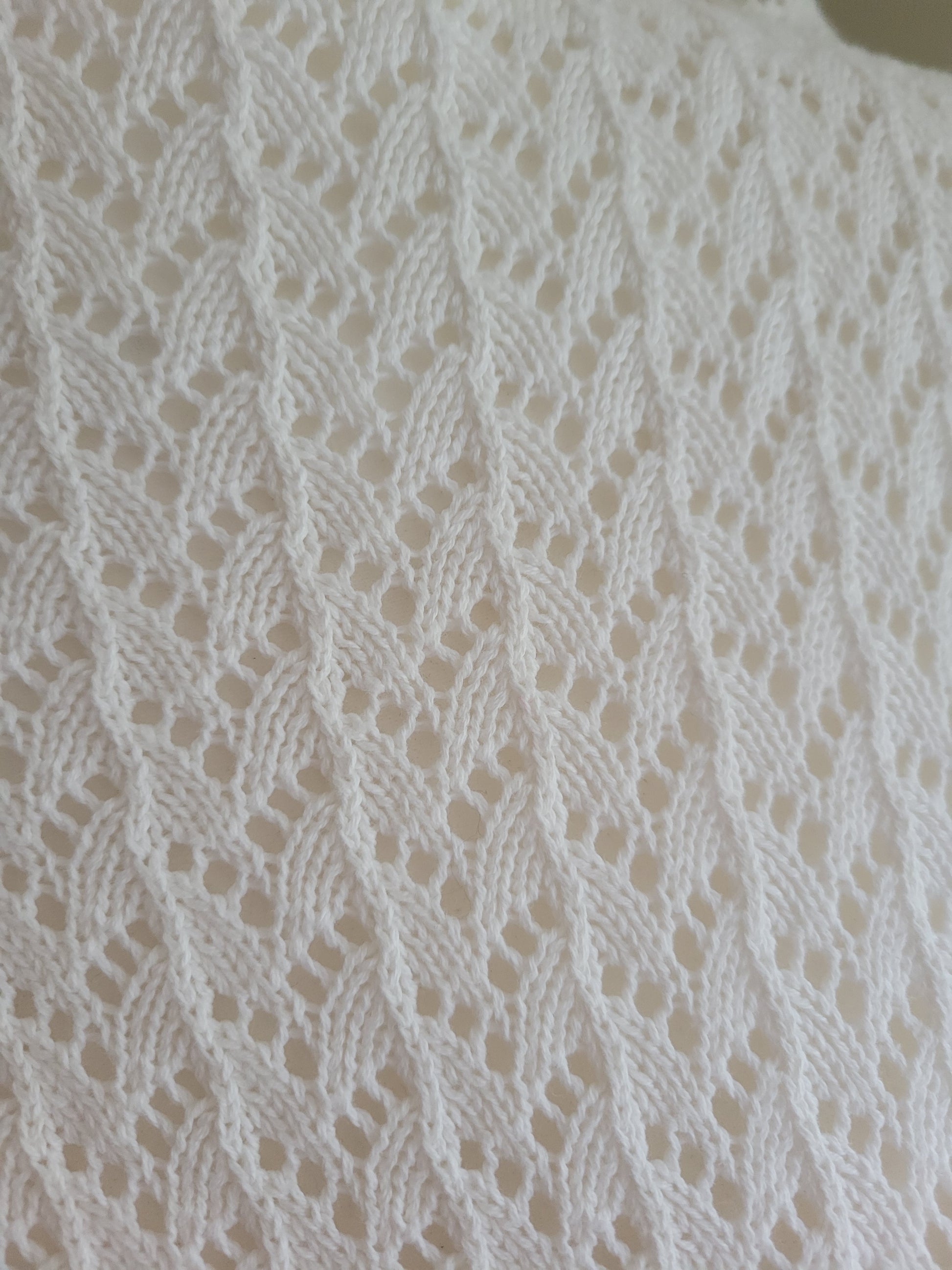 Light as winter’s first snowfall, this open-knit white cardigan adds a touch of softness to any outfit. The delicate lace-patterned weave and horizontal ribbing at the hem and cuffs create a look that’s both feminine and quietly refined. Its bright white hue makes it a perfect layering piece for winter — pairing beautifully with gray, black, or jewel tones to bring a fresh, luminous touch.